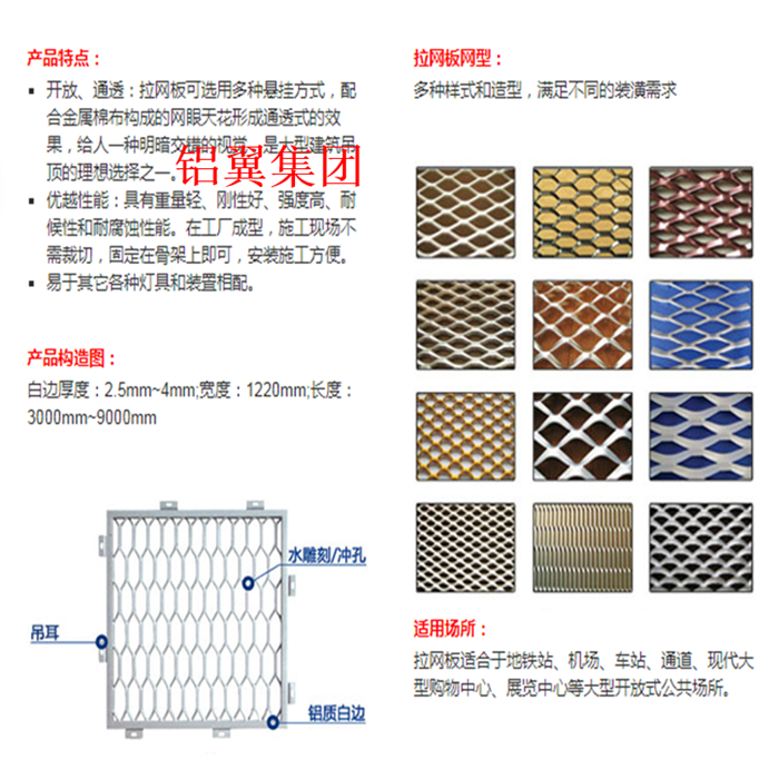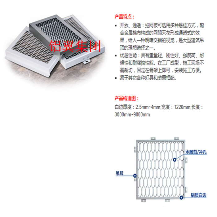 專業(yè)生產(chǎn)鋁拉網(wǎng)板、鋁板網(wǎng)、玻璃棉氈鋁板網(wǎng)吸聲墻面、鋁板沖孔網(wǎng)廠家,經(jīng)驗(yàn)豐富,按圖均可定制。 鋁網(wǎng)板、沖孔鋁板、拉網(wǎng)天花、鋁拉網(wǎng)幕墻、拉伸鋁網(wǎng)、鋁拉網(wǎng)吊頂、幕墻鋁板網(wǎng)等,款式齊全,按圖定制生產(chǎn)。沖孔網(wǎng)鋁板定制孔型:長孔、圓孔、方孔、三角孔、魚鱗孔、橋式孔、菱形孔、五角孔、六角孔、八孔、十字孔、指甲孔、梅花孔、人字孔、及其它異形孔。鋁翼集團(tuán)集研發(fā)、設(shè)計、生產(chǎn)、定制及銷售服務(wù)為一體的大型拉網(wǎng)鋁單板生產(chǎn)廠家,注冊資金3180萬元,工廠總占地面積約30萬平方,真正的實(shí)力廠家,接大單急單有優(yōu)勢。 實(shí)力廠家更值得信賴,源頭工廠直銷價格更優(yōu)惠,歡迎詢價,歡迎蒞臨公司注冊地實(shí)地考察!
